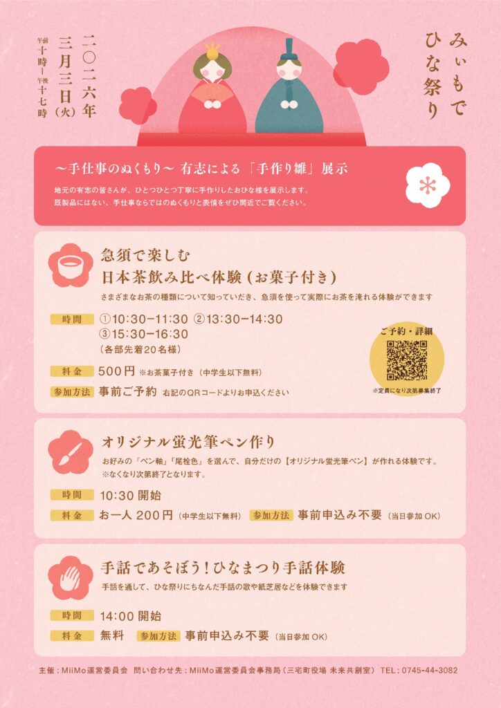 今年は「手仕事のぬくもり」…有志による「手作り雛」も展示します。他にも・日本茶飲み比べ体験・オリジナル蛍光筆ペン作り・ひなまつり手話体験 なども実施。ご来場お待ちしています。