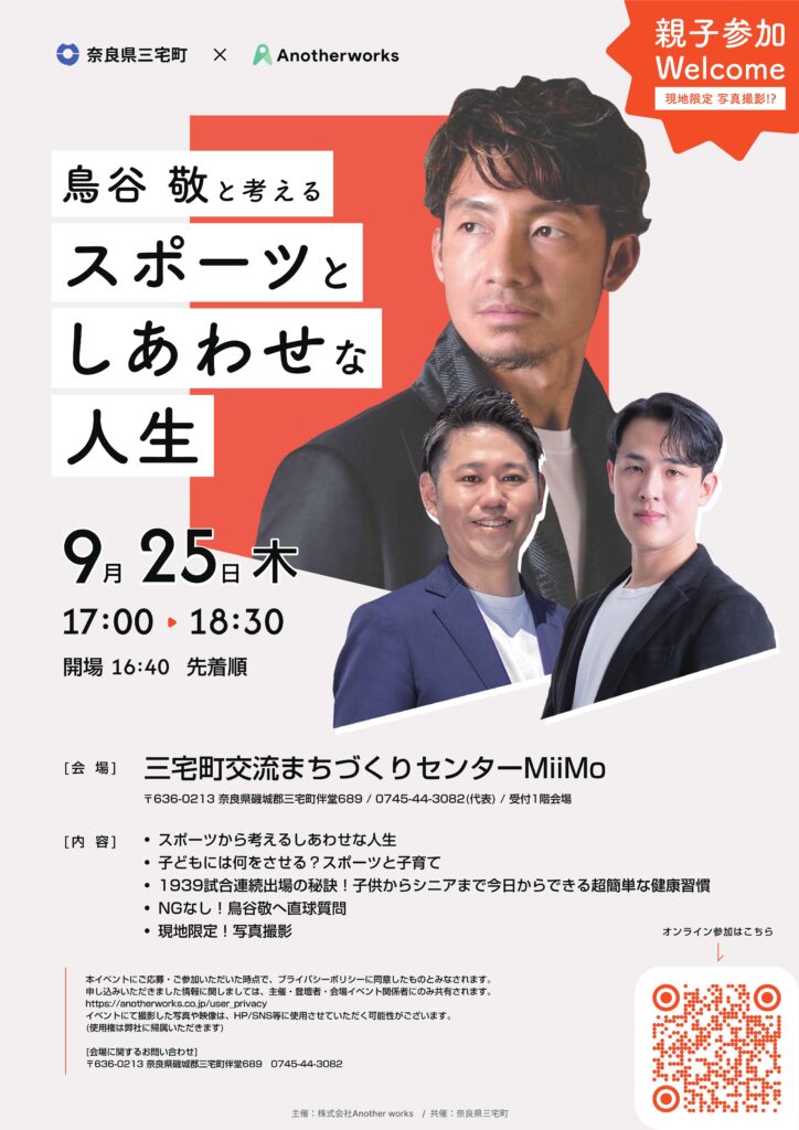 三宅町では、阪神タイガースで活躍された元プロ野球選手・鳥谷敬氏をお迎えし、スポーツを通じた生き方や幸せについて考える講演イベントを開催します。